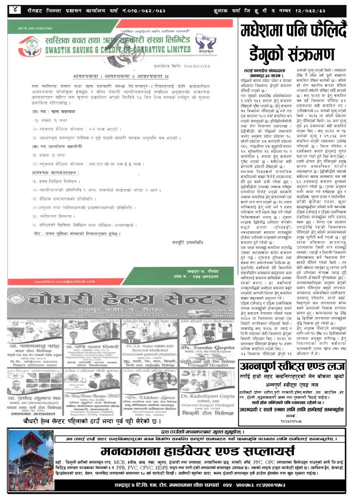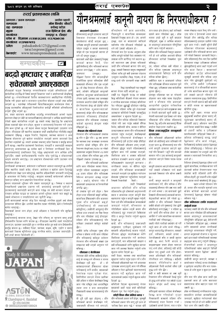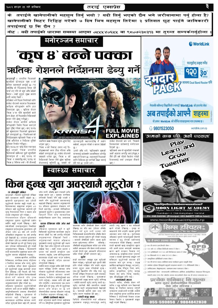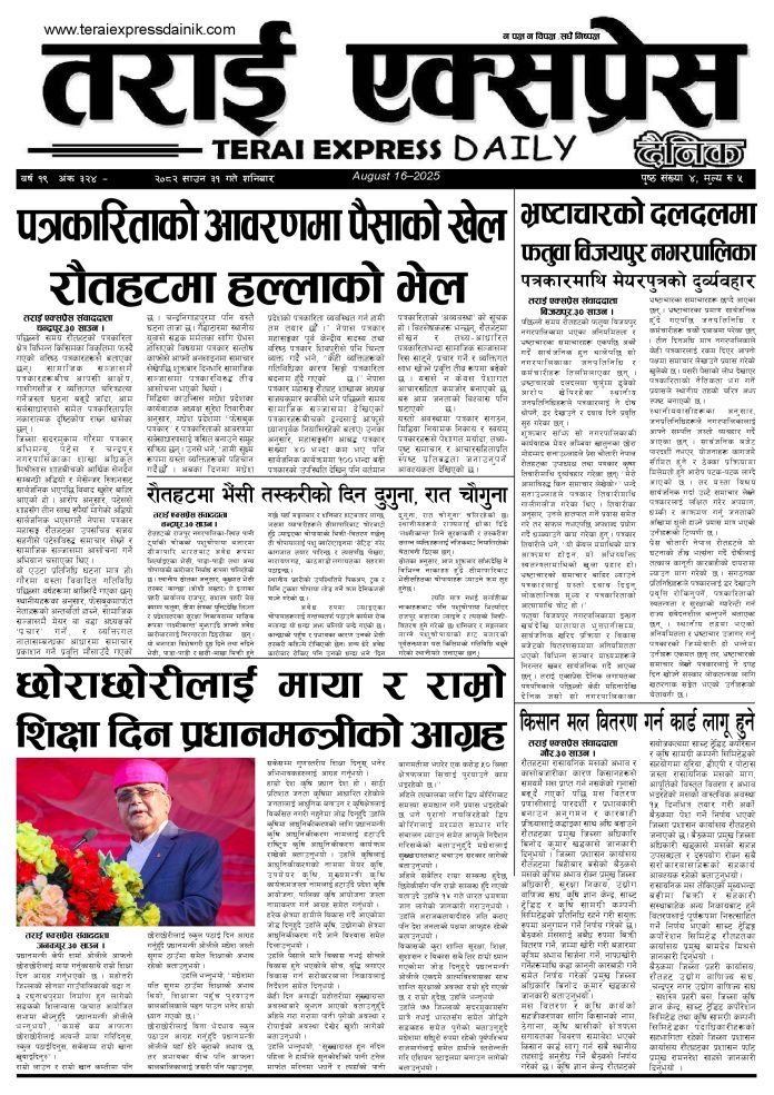 ई पेपर २०८२ साउन ३१ गतेको तराई एक्सप्रेस दैनिक तराई एक्सप्रेस दैनिक - August 16, 2025 RELATED ARTICLESMORE FROM AUTHOR २०७३ वैशाख ९ गतेको तराई एक्सप्रेस दैनिक २०८२ वैशाख ८ गतेको तराई एक्सप्रेस दैनिक २०७३ वैशाख ३ गतेको तराई एक्सप्रेस दैनिक ताजा अपडेट ४० करोड कागज मिलाएको आरोपले मौलापुर ततायो April 23, 2026 ‘सेफ गल्र्स’ परियोजनाअन्तर्गत सेवा प्रदायक लक्षित पाँच दिने तालिम सम्पन्न April 23, 2026 यातायात व्यवस्था कार्यालय गौरमा सेवाग्राहीलाई ठगी गरेको आरोपमा एक जना पक्राउ April 22, 2026 जिल्ला धाउने दिन सकिने दाबी, व्यवहारमा कति सम्भव ? April 22, 2026 २६ दिनमै ढल्यो गृहमन्त्रीको कुर्सी, सुधन गुरुङ ‘लगानी काण्ड’मा आउट! April 22, 2026 धेरैले पढेको ४० करोड कागज मिलाएको आरोपले मौलापुर ततायो April 23, 2026 ‘सेफ गल्र्स’ परियोजनाअन्तर्गत सेवा प्रदायक लक्षित पाँच दिने तालिम सम्पन्न April 23, 2026 यातायात व्यवस्था कार्यालय गौरमा सेवाग्राहीलाई ठगी गरेको आरोपमा एक जना पक्राउ April 22, 2026 जिल्ला धाउने दिन सकिने दाबी, व्यवहारमा कति सम्भव ? April 22, 2026 २६ दिनमै ढल्यो गृहमन्त्रीको कुर्सी, सुधन गुरुङ ‘लगानी काण्ड’मा आउट! April 22, 2026
