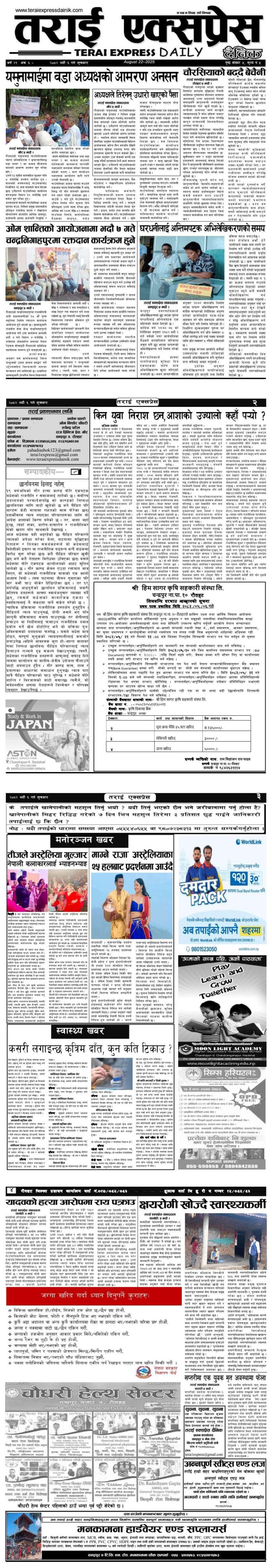 ई पेपर २०८२ भदौ ६ गतेको तराई एक्सप्रेस दैनिक तराई एक्सप्रेस दैनिक - August 22, 2025 RELATED ARTICLESMORE FROM AUTHOR २०७३ वैशाख ९ गतेको तराई एक्सप्रेस दैनिक २०८२ वैशाख ८ गतेको तराई एक्सप्रेस दैनिक २०७३ वैशाख ३ गतेको तराई एक्सप्रेस दैनिक ताजा अपडेट जिल्ला धाउने दिन सकिने दाबी, व्यवहारमा कति सम्भव ? April 22, 2026 २६ दिनमै ढल्यो गृहमन्त्रीको कुर्सी, सुधन गुरुङ ‘लगानी काण्ड’मा आउट! April 22, 2026 २०७३ वैशाख ९ गतेको तराई एक्सप्रेस दैनिक April 22, 2026 राजमार्ग कब्जा गर्नेको दिन गयो: सरकार ‘एक्सन मोड’मा April 21, 2026 काजको आडमा असुली धन्धा : प्रहरीभित्रै ‘नेटवर्क’ चल्दै April 21, 2026 धेरैले पढेको जिल्ला धाउने दिन सकिने दाबी, व्यवहारमा कति सम्भव ? April 22, 2026 २६ दिनमै ढल्यो गृहमन्त्रीको कुर्सी, सुधन गुरुङ ‘लगानी काण्ड’मा आउट! April 22, 2026 २०७३ वैशाख ९ गतेको तराई एक्सप्रेस दैनिक April 22, 2026 राजमार्ग कब्जा गर्नेको दिन गयो: सरकार ‘एक्सन मोड’मा April 21, 2026 काजको आडमा असुली धन्धा : प्रहरीभित्रै ‘नेटवर्क’ चल्दै April 21, 2026