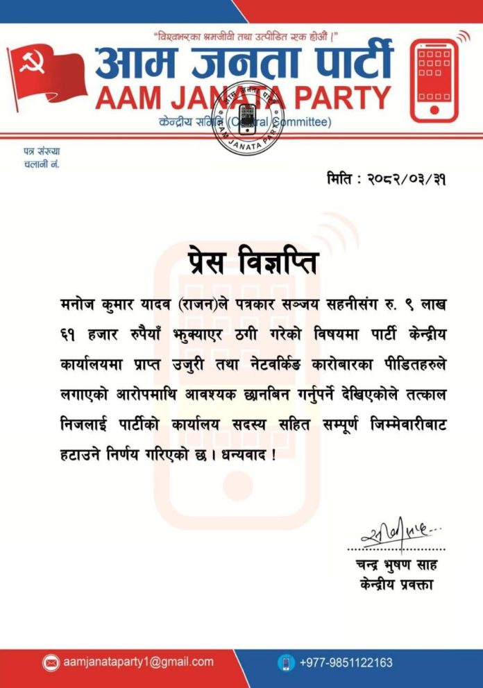 आम जनता पार्टी (आजपा) ले विगतमा कारवाही गरी पार्टीबाट निष्काशन गरिसकेका केही व्यक्तिलाई आजपाकै हैसियतमा टिका लगाएर एमाले अध्यक्ष एवं प्रधानमन्त्री केपी शर्मा ओलीले पार्टी प्रवेश गरेको भन्दै भ्रमपूर्ण एवं झुठको प्रचार गरिरहेको जनाएको छ ।