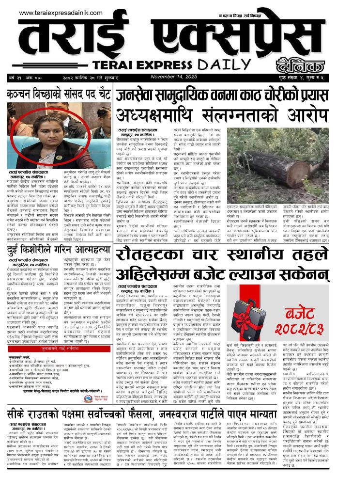 ई पेपर २०८२ कार्तिक २८ गतेको तराई एक्सप्रेस दैनिक तराई एक्सप्रेस दैनिक - November 14, 2025 RELATED ARTICLESMORE FROM AUTHOR २०८२ कार्तिक २७ गतेको तराई एक्सप्रेस दैनिक २०८२ कार्तिक २५ गतेको तराई एक्सप्रेस दैनिक २०८२ कार्तिक २४ गतेको तराई एक्सप्रेस दैनिक ताजा अपडेट प्रचण्डको नयाँ पार्टीमा नेकपा एस समूहको दबदबा, माओवादी केन्द्र रौतहटबाट सुन्य... November 14, 2025 चन्द्रोदय साकोसद्वारा महिलाको प्रजनन रुग्णता सम्बन्धी निःशुल्क स्वास्थ्य शिविर सम्पन्न, २... November 14, 2025 सरकारले सुन–चाँदी लगायत बहुमूल्य धातुको कारोबारमा कडाइ गर्यो November 14, 2025 यौनसम्बन्धी खुला संवाद नहुँदा समस्या थपिन थालेको विशेषज्ञको चेतावनी November 14, 2025 दुई दिनभित्र दुई किशोरीले जीवन समाप्त गरिन् November 13, 2025 धेरैले पढेको प्रचण्डको नयाँ पार्टीमा नेकपा एस समूहको दबदबा, माओवादी केन्द्र रौतहटबाट सुन्य... November 14, 2025 चन्द्रोदय साकोसद्वारा महिलाको प्रजनन रुग्णता सम्बन्धी निःशुल्क स्वास्थ्य शिविर सम्पन्न, २... November 14, 2025 सरकारले सुन–चाँदी लगायत बहुमूल्य धातुको कारोबारमा कडाइ गर्यो November 14, 2025 यौनसम्बन्धी खुला संवाद नहुँदा समस्या थपिन थालेको विशेषज्ञको चेतावनी November 14, 2025 दुई दिनभित्र दुई किशोरीले जीवन समाप्त गरिन् November 13, 2025