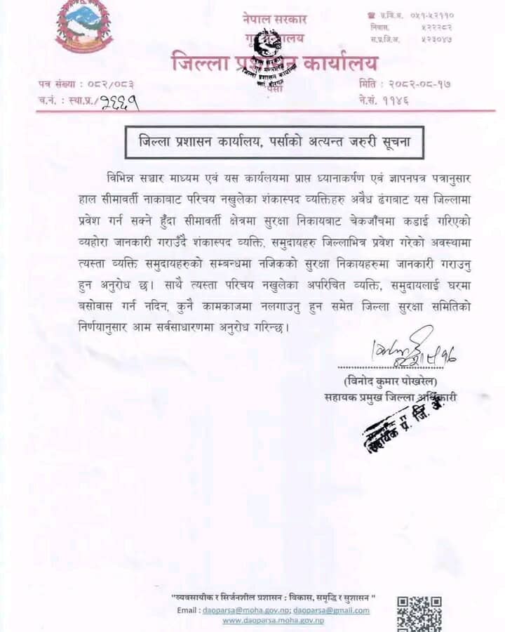 जिल्ला प्रशासन कार्यालय पर्साले जिल्लाका सीमा नाकामा कडाइ गरेको जनाएको छ। प्रशासनले सुरक्षा सतर्कता बढाउँदै नेपाल–भारत सीमामा अवैध प्रवेश रोकिने गरी निगरानी थप कडा पारेको हो।