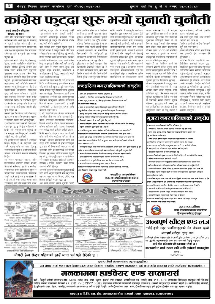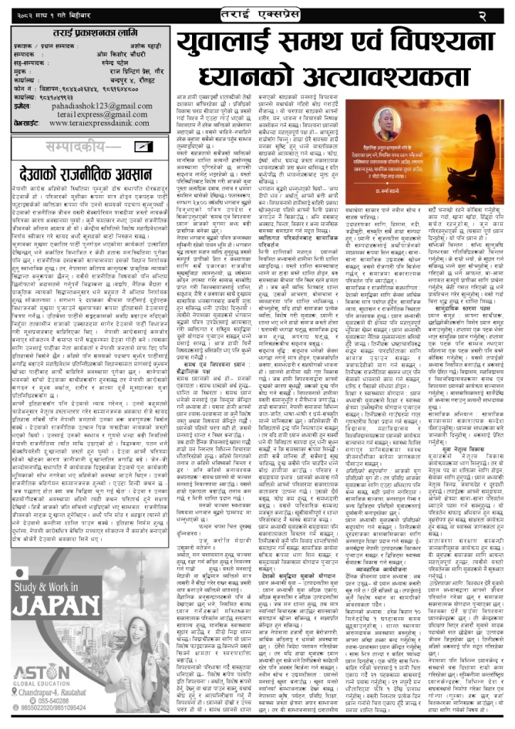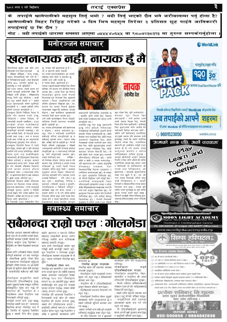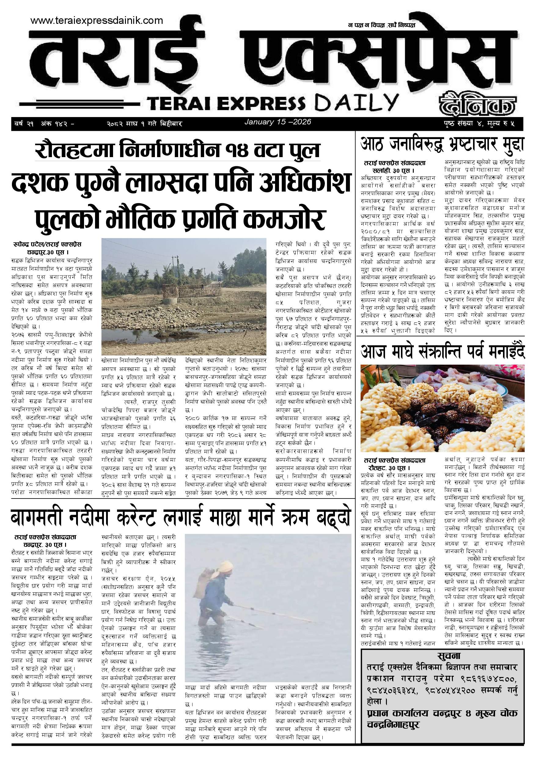 ई पेपर २०८२ माघ १ गतेको तराई एक्सप्रेस दैनिक तराई एक्सप्रेस दैनिक - January 15, 2026 RELATED ARTICLESMORE FROM AUTHOR २०८२ माघ २ गतेको तराई एक्सप्रेस दैनिक २०८२ पुस ३० गतेको तराई एक्सप्रेस दैनिक २०८२ पुस २९ गतेको तराई एक्सप्रेस दैनिक ताजा अपडेट प्रतिनिधिसभा निर्वाचन तयारी तीव्र : आजै सबै निर्वाचन क्षेत्रमा निर्वाचन अधिकृतको... January 16, 2026 २०८२ माघ २ गतेको तराई एक्सप्रेस दैनिक January 16, 2026 टिपरको ठक्करबाट एकको मृत्यु, एक महिला गम्भीर घाइते January 15, 2026 पवित्र मन्दिरमै आर्थिक चलखेल ,भेपर लाइट बिग्रिँदा स्थानीय आक्रोशित January 15, 2026 विशेष महाधिवेशनको माग गर्दै देउवा पक्ष निर्वाचन आयोगमा January 14, 2026 धेरैले पढेको प्रतिनिधिसभा निर्वाचन तयारी तीव्र : आजै सबै निर्वाचन क्षेत्रमा निर्वाचन अधिकृतको... January 16, 2026 २०८२ माघ २ गतेको तराई एक्सप्रेस दैनिक January 16, 2026 टिपरको ठक्करबाट एकको मृत्यु, एक महिला गम्भीर घाइते January 15, 2026 पवित्र मन्दिरमै आर्थिक चलखेल ,भेपर लाइट बिग्रिँदा स्थानीय आक्रोशित January 15, 2026 विशेष महाधिवेशनको माग गर्दै देउवा पक्ष निर्वाचन आयोगमा January 14, 2026