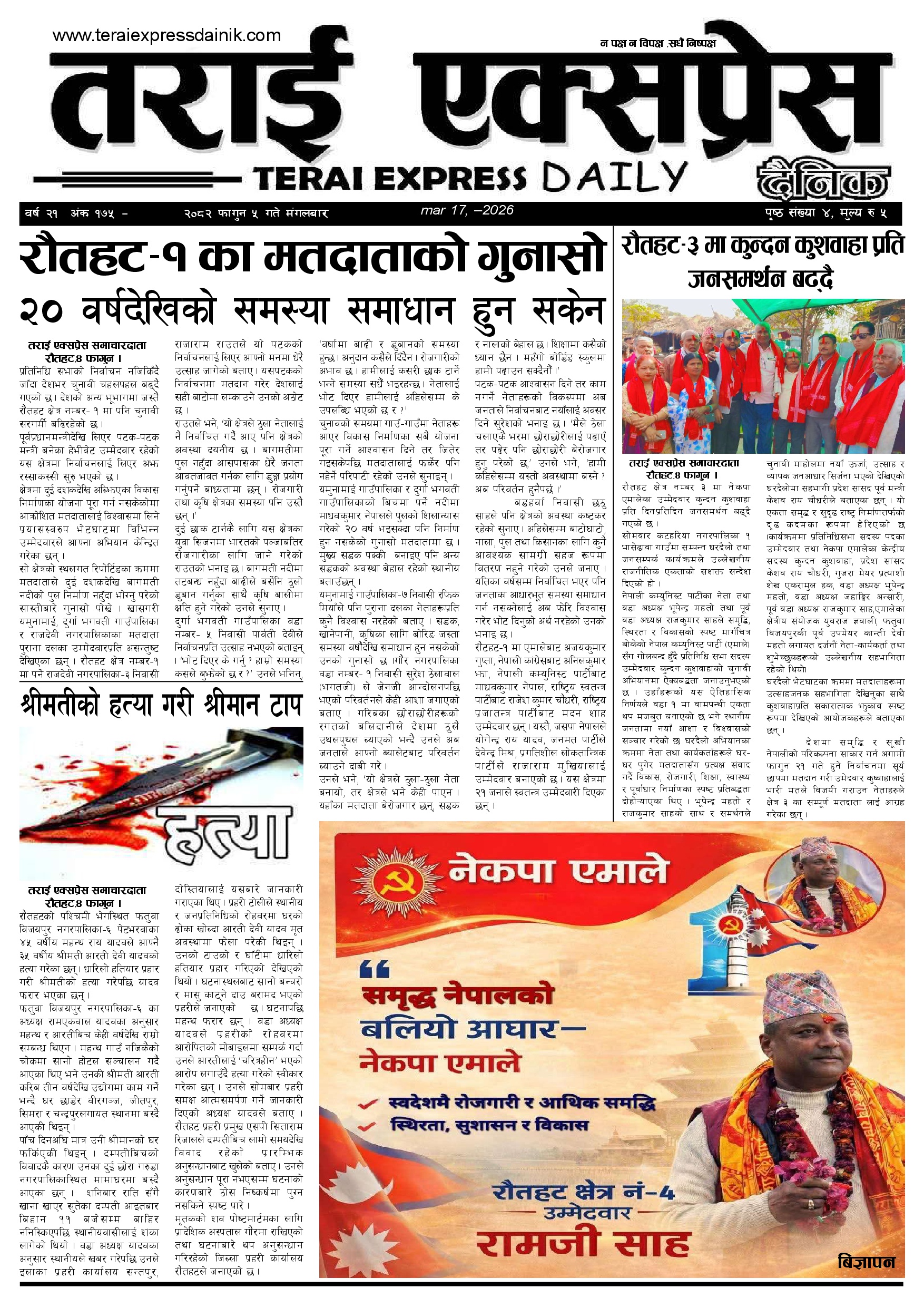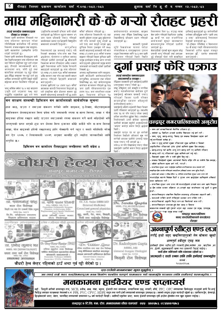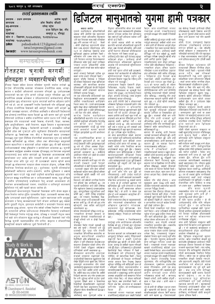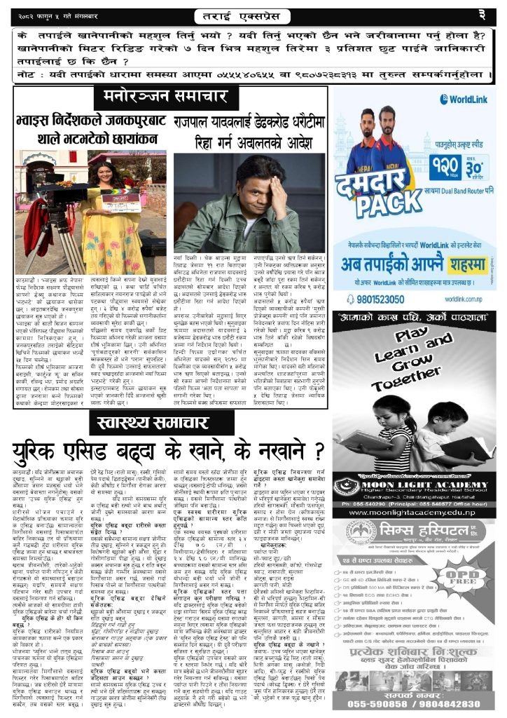 ई पेपर २०८२ फागुन ५ गतेको तराई एक्सप्रेस दैनिक तराई एक्सप्रेस दैनिक - February 17, 2026 RELATED ARTICLESMORE FROM AUTHOR २०७३ वैशाख ९ गतेको तराई एक्सप्रेस दैनिक २०८२ वैशाख ८ गतेको तराई एक्सप्रेस दैनिक २०७३ वैशाख ३ गतेको तराई एक्सप्रेस दैनिक ताजा अपडेट यातायात व्यवस्था कार्यालय गौरमा सेवाग्राहीलाई ठगी गरेको आरोपमा एक जना पक्राउ April 22, 2026 जिल्ला धाउने दिन सकिने दाबी, व्यवहारमा कति सम्भव ? April 22, 2026 २६ दिनमै ढल्यो गृहमन्त्रीको कुर्सी, सुधन गुरुङ ‘लगानी काण्ड’मा आउट! April 22, 2026 २०७३ वैशाख ९ गतेको तराई एक्सप्रेस दैनिक April 22, 2026 राजमार्ग कब्जा गर्नेको दिन गयो: सरकार ‘एक्सन मोड’मा April 21, 2026 धेरैले पढेको यातायात व्यवस्था कार्यालय गौरमा सेवाग्राहीलाई ठगी गरेको आरोपमा एक जना पक्राउ April 22, 2026 जिल्ला धाउने दिन सकिने दाबी, व्यवहारमा कति सम्भव ? April 22, 2026 २६ दिनमै ढल्यो गृहमन्त्रीको कुर्सी, सुधन गुरुङ ‘लगानी काण्ड’मा आउट! April 22, 2026 २०७३ वैशाख ९ गतेको तराई एक्सप्रेस दैनिक April 22, 2026 राजमार्ग कब्जा गर्नेको दिन गयो: सरकार ‘एक्सन मोड’मा April 21, 2026