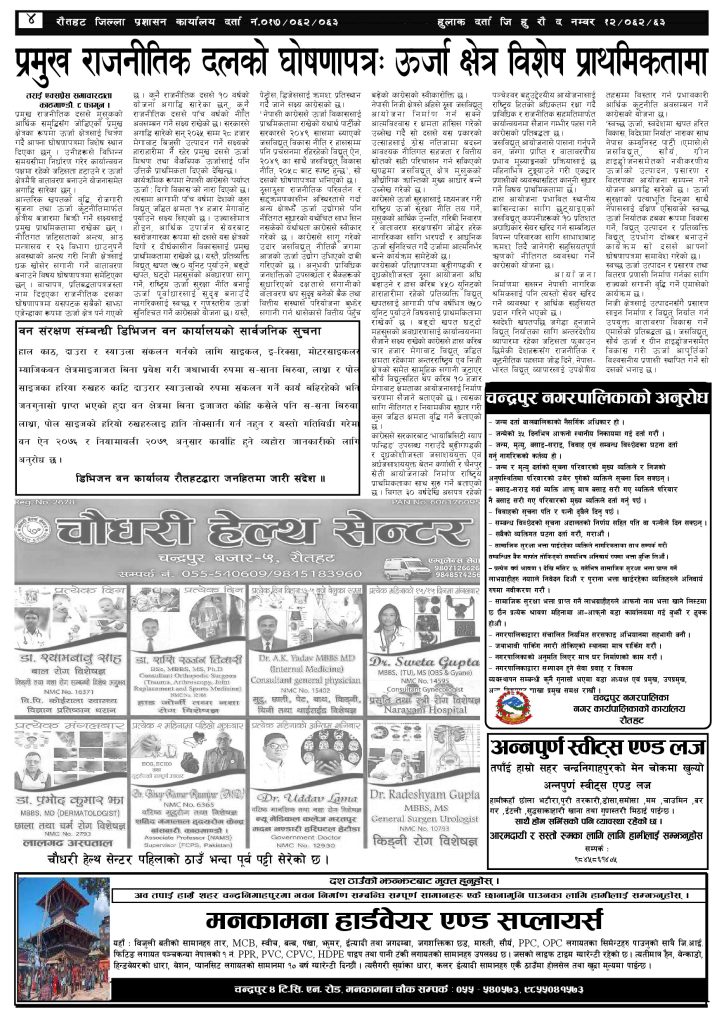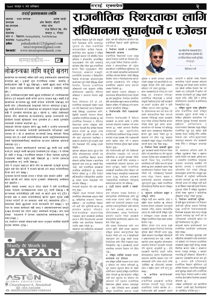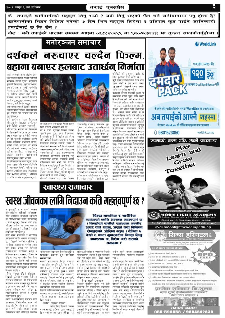 ई पेपर २०८२ फागुन ९ गतेको तराई एक्सप्रेस दैनिक तराई एक्सप्रेस दैनिक - February 21, 2026 RELATED ARTICLESMORE FROM AUTHOR २०७३ वैशाख ३ गतेको तराई एक्सप्रेस दैनिक २०८२ चैत ३० गतेको तराई एक्सप्रेस दैनिक २०८२ चैत २९ गतेको तराई एक्सप्रेस दैनिक ताजा अपडेट चन्द्रपुर १० का परियार पोखराबाट पक्राउ April 17, 2026 २०७३ वैशाख ३ गतेको तराई एक्सप्रेस दैनिक April 16, 2026 शिवशक्ति सामुदायिक वनको सयौं रुख सफाया April 16, 2026 ऋषि धमलाको रिपोर्टर क्लबमा समाज कल्याण परिषद्को हमला April 13, 2026 मधेसको कडाइको ‘रिटर्न गिफ्ट’ : भारतमा नेपालीलाई पेट्रोल बन्द April 13, 2026 धेरैले पढेको चन्द्रपुर १० का परियार पोखराबाट पक्राउ April 17, 2026 २०७३ वैशाख ३ गतेको तराई एक्सप्रेस दैनिक April 16, 2026 शिवशक्ति सामुदायिक वनको सयौं रुख सफाया April 16, 2026 ऋषि धमलाको रिपोर्टर क्लबमा समाज कल्याण परिषद्को हमला April 13, 2026 मधेसको कडाइको ‘रिटर्न गिफ्ट’ : भारतमा नेपालीलाई पेट्रोल बन्द April 13, 2026
