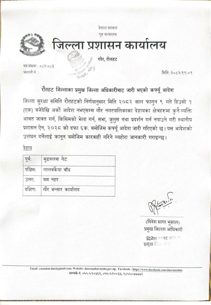 सदरमुकाम गौरका केही संवेदनशील क्षेत्रमा कर्फ्यु लागू गरिएको प्रशासनले जनाएको छ । रौतहटका प्रमुख जिल्ला अधिकारी दिनेश सागर भुसालको आदेश तथा जिल्ला सुरक्षा समितिको निर्णयअनुसार शनिबारदेखि अर्को आदेश नभएसम्मका लागि कर्फ्यु लागू गरिएको हो ।