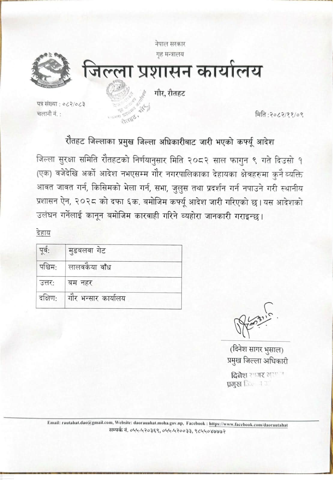 जारी आदेशअनुसार पूर्वमा मुडवलवा गेट, पश्चिममा लालबकैया खोला, उत्तरमा जमुना नहर र दक्षिणमा गौर भन्सार कार्यालयसम्मको क्षेत्रलाई कर्फ्यु क्षेत्र तोकिएको छ । तोकिएको क्षेत्रमा पाँच जनाभन्दा बढी व्यक्ति भेला हुन, सभा,जुलुस गर्न, प्रदर्शन गर्न तथा आवतजावतमा अवरोध सिर्जना गर्ने कुनै पनि गतिविधि पूर्ण रूपमा निषेध गरिएको छ ।
