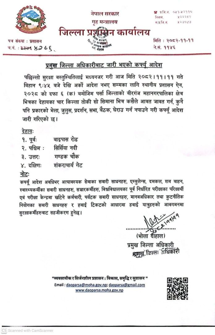 पर्साका प्रमुख जिल्ला अधिकारी Bhola Dahalले जारी गरेको सूचनामा सुरक्षा स्थितिलाई नियन्त्रणमा ल्याउन कडा कदम चालिएको उल्लेख छ। कर्फ्यु लागू भएपछि ठूलो संख्यामा प्रहरी तथा नेपाली सेना परिचालन गरिएको छ।