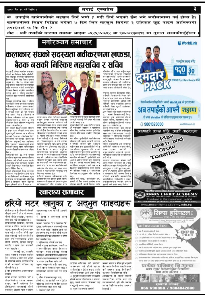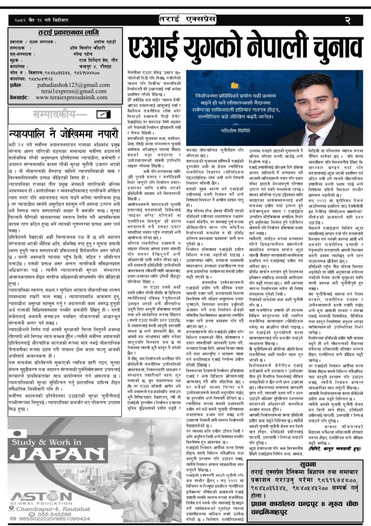 Uncategorized २०८२ चैत्र १२ गतेको तराई एक्सप्रेस दैनिक तराई एक्सप्रेस दैनिक - March 26, 2026 RELATED ARTICLESMORE FROM AUTHOR भारत र चीनबीचको पुरानो ‘सीमा व्यापार’ फेरि ब्यूँतिने तयारी—तर नेपाल फेरि साक्षी मात्र ! मिटरब्याज पीडितको पक्षमा आन्दोलन चर्किँदै, देशव्यापी दबाब बढाउने चेतावनी गौरमा कर्फ्यु हट्यो, सद्भाव र्याली सम्पन्न ताजा अपडेट २०७३ वैशाख ३ गतेको तराई एक्सप्रेस दैनिक April 16, 2026 शिवशक्ति सामुदायिक वनको सयौं रुख सफाया April 16, 2026 ऋषि धमलाको रिपोर्टर क्लबमा समाज कल्याण परिषद्को हमला April 13, 2026 मधेसको कडाइको ‘रिटर्न गिफ्ट’ : भारतमा नेपालीलाई पेट्रोल बन्द April 13, 2026 वीरगन्जमा ‘अवैध सम्बन्ध’ ले लियो प्रहरी जवानको ज्यान, April 13, 2026 धेरैले पढेको २०७३ वैशाख ३ गतेको तराई एक्सप्रेस दैनिक April 16, 2026 शिवशक्ति सामुदायिक वनको सयौं रुख सफाया April 16, 2026 ऋषि धमलाको रिपोर्टर क्लबमा समाज कल्याण परिषद्को हमला April 13, 2026 मधेसको कडाइको ‘रिटर्न गिफ्ट’ : भारतमा नेपालीलाई पेट्रोल बन्द April 13, 2026 वीरगन्जमा ‘अवैध सम्बन्ध’ ले लियो प्रहरी जवानको ज्यान, April 13, 2026