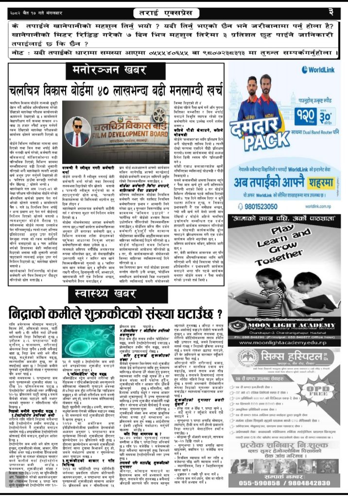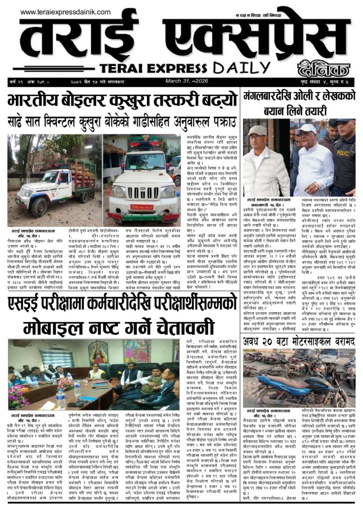 ई पेपर २०८२ चैत १७ गतेको तराई एक्सप्रेस दैनिक तराई एक्सप्रेस दैनिक - March 31, 2026 RELATED ARTICLESMORE FROM AUTHOR २०७३ वैशाख ३ गतेको तराई एक्सप्रेस दैनिक २०८२ चैत ३० गतेको तराई एक्सप्रेस दैनिक २०८२ चैत २९ गतेको तराई एक्सप्रेस दैनिक ताजा अपडेट २०७३ वैशाख ३ गतेको तराई एक्सप्रेस दैनिक April 16, 2026 शिवशक्ति सामुदायिक वनको सयौं रुख सफाया April 16, 2026 ऋषि धमलाको रिपोर्टर क्लबमा समाज कल्याण परिषद्को हमला April 13, 2026 मधेसको कडाइको ‘रिटर्न गिफ्ट’ : भारतमा नेपालीलाई पेट्रोल बन्द April 13, 2026 वीरगन्जमा ‘अवैध सम्बन्ध’ ले लियो प्रहरी जवानको ज्यान, April 13, 2026 धेरैले पढेको २०७३ वैशाख ३ गतेको तराई एक्सप्रेस दैनिक April 16, 2026 शिवशक्ति सामुदायिक वनको सयौं रुख सफाया April 16, 2026 ऋषि धमलाको रिपोर्टर क्लबमा समाज कल्याण परिषद्को हमला April 13, 2026 मधेसको कडाइको ‘रिटर्न गिफ्ट’ : भारतमा नेपालीलाई पेट्रोल बन्द April 13, 2026 वीरगन्जमा ‘अवैध सम्बन्ध’ ले लियो प्रहरी जवानको ज्यान, April 13, 2026