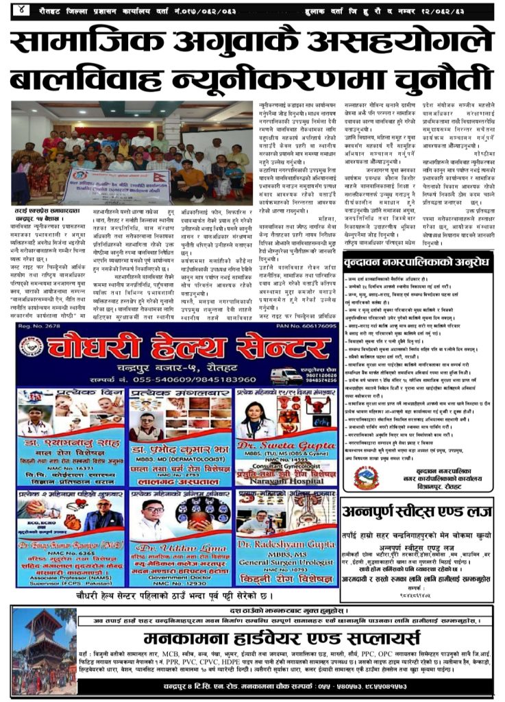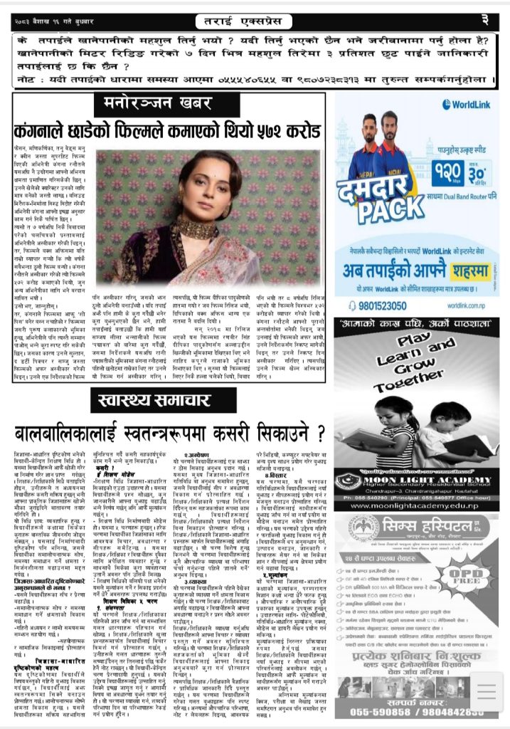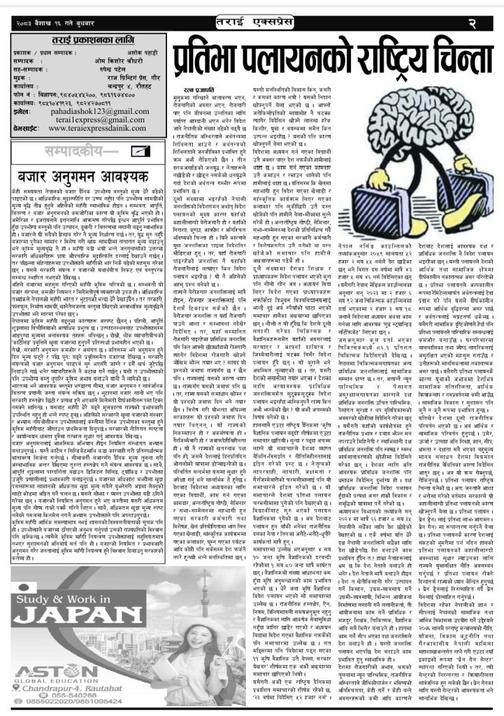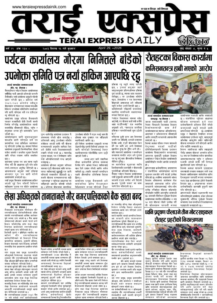 ई पेपर २०८३ वैशाख १६ गतेको तराई एक्सप्रेस दैनिक तराई एक्सप्रेस दैनिक - April 29, 2026 RELATED ARTICLESMORE FROM AUTHOR २०८३ वैशाख १५ गतेको तराई एक्सप्रेस दैनिक २०८३ वैशाख १४ गतेको तराई एक्सप्रेस दैनिक २०८३ वैशाख १३ गतेको तराई एक्सप्रेस दैनिक ताजा अपडेट टेकान देखी झन्झनेटोल जाने राजकुलो अतिक्रमणले खुम्चियो : मौन चन्द्रपुर नगरपालिका April 29, 2026 पराजयपछि पहिलोपटक सर्लाही पुगे गगन थापा April 29, 2026 बारा–पर्सा–धनुषा अलर्ट: मेघगर्जनसहित विनाशकारी हावाहुरीको संकेत April 29, 2026 २०८३ वैशाख १५ गतेको तराई एक्सप्रेस दैनिक April 28, 2026 नारा ठूला, काम शून्य: मधेसका ‘गौरव’ योजना कागजमै सीमित April 27, 2026 धेरैले पढेको टेकान देखी झन्झनेटोल जाने राजकुलो अतिक्रमणले खुम्चियो : मौन चन्द्रपुर नगरपालिका April 29, 2026 पराजयपछि पहिलोपटक सर्लाही पुगे गगन थापा April 29, 2026 बारा–पर्सा–धनुषा अलर्ट: मेघगर्जनसहित विनाशकारी हावाहुरीको संकेत April 29, 2026 २०८३ वैशाख १५ गतेको तराई एक्सप्रेस दैनिक April 28, 2026 नारा ठूला, काम शून्य: मधेसका ‘गौरव’ योजना कागजमै सीमित April 27, 2026